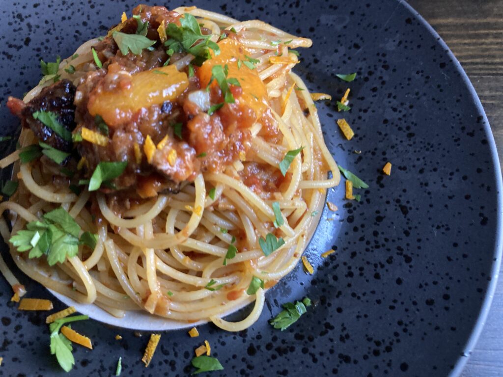 豚バラ肉をオレンジ、甘口の酒精強化ワイン、ソフリット、トマトで長時間煮込んで作ったボロネーゼソースです。