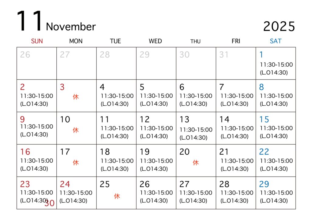 11月の営業スケジュールのお知らせです。 11月の月替わりパスタは「柿とゴルゴンゾーラ ペンネ」です。 柿の自然な甘みと、ドルチェタイプのゴルゴンゾーラ(青カビ入りのイタリアのチーズ)のコクが重なり合う秋限定の一皿です。 まろやかなソースがペンネによく絡み、後口にほんのり残るチーズの余韻をお楽しみください。 それでは11月もどうぞよろしくお願い申し上げます。