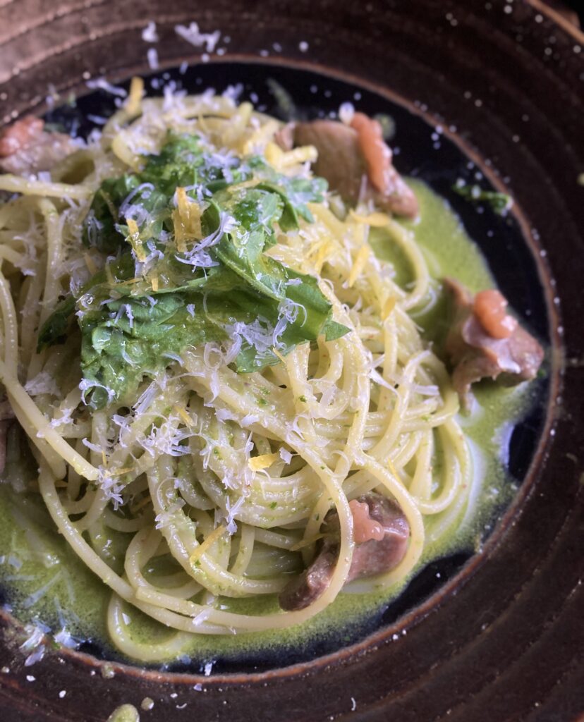 1月の月替わりパスタは「春菊と梅のスパゲッティ 砂肝のコンフィ」です。